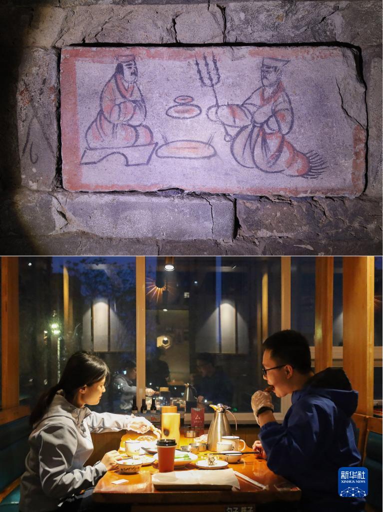 拼版照片:上圖為嘉峪關(guān)魏晉墓六號墓的畫(huà)像磚展現男主人宴請賓客的場(chǎng)景(5月13日攝);下圖為游客在嘉峪關(guān)市的一家烤肉店吃烤肉(5月12日攝)。