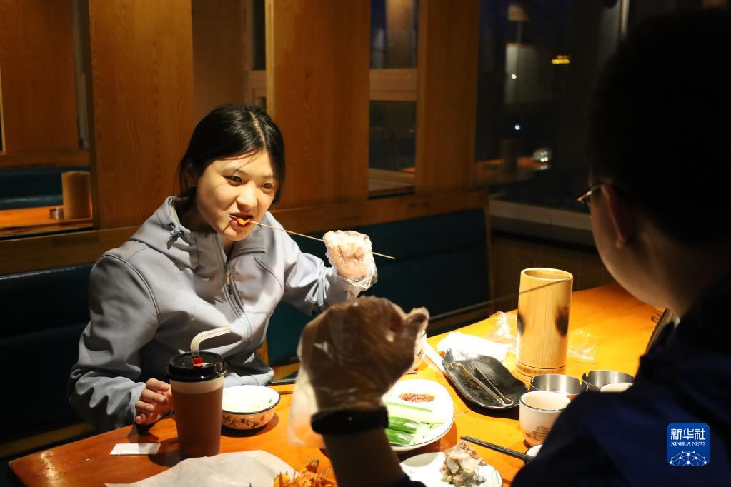 5月12日,游客在嘉峪關(guān)市的一家烤肉店吃烤肉。