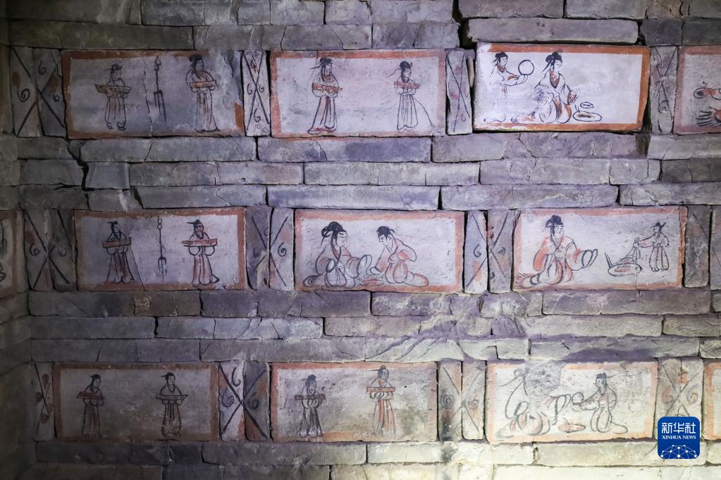 在嘉峪關(guān)魏晉墓六號墓的畫(huà)像磚上,繪有墓葬女主人宴請賓客的場(chǎng)景(5月10日攝)。