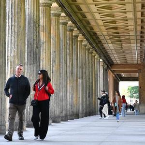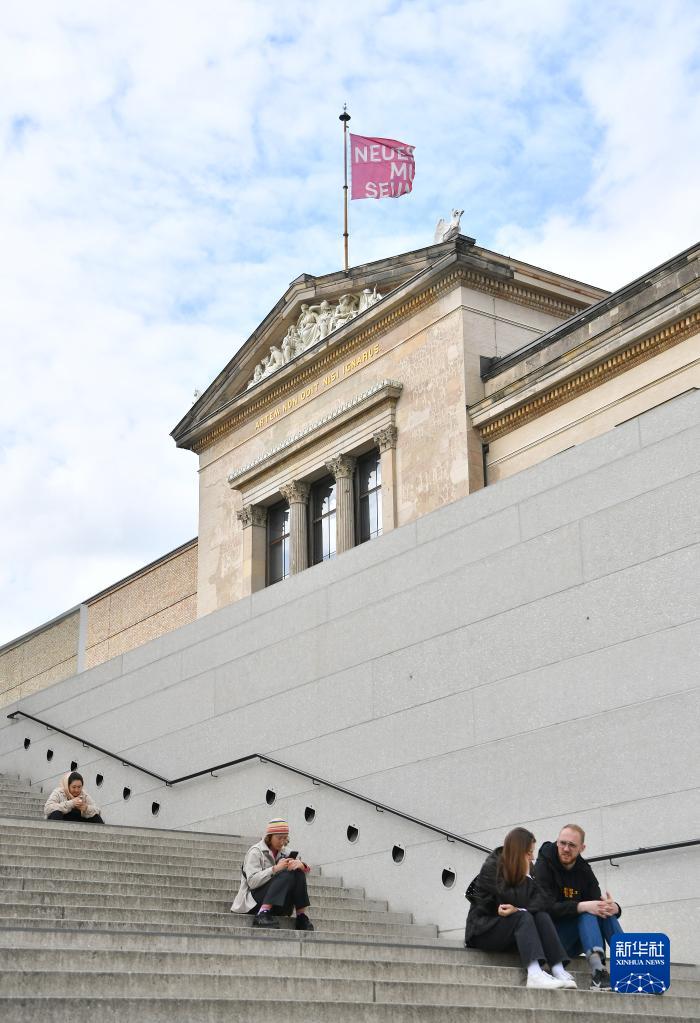 5月16日,在德國柏林博物館島,人們坐在新博物館旁的臺階上休息。