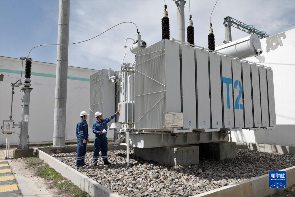 4月3日,在哈薩克斯坦札納塔斯,阿比爾加濟耶夫(右)與同事檢查風(fēng)電場(chǎng)變壓設備。