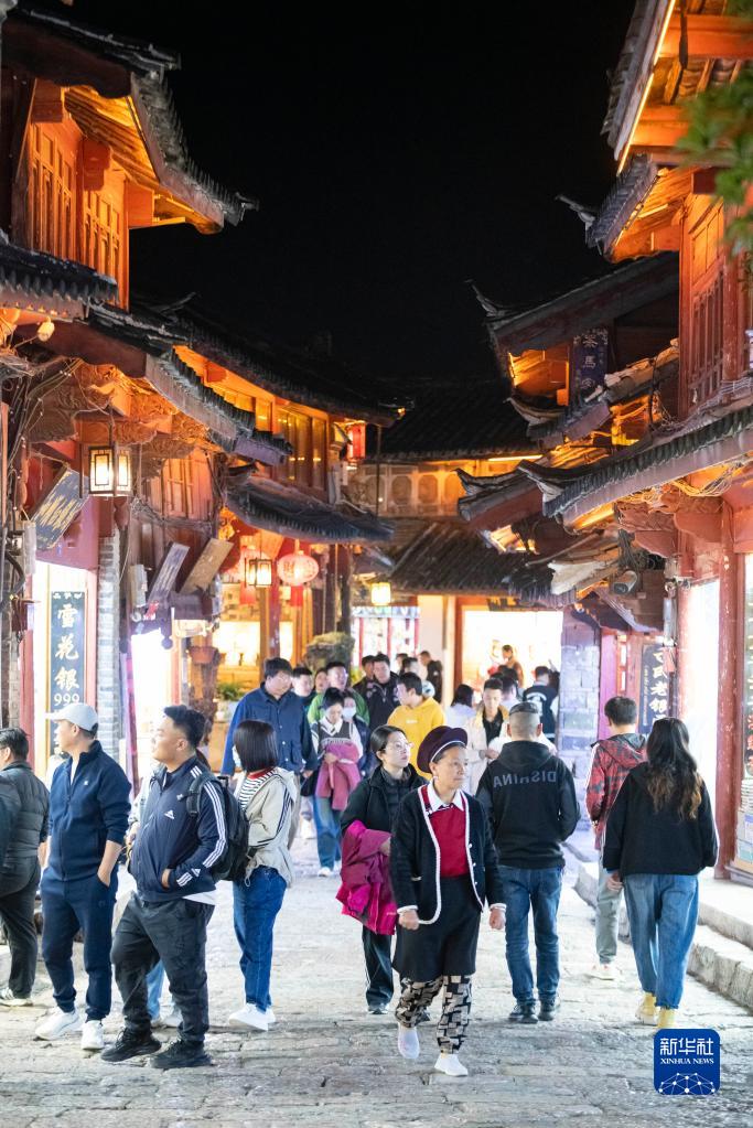 夜幕降臨,華燈初上,云南麗江古城內熙熙攘攘,來(lái)自各地的游客在這里就餐、購物、休閑娛樂(lè ),體驗古城“夜經(jīng)濟”。