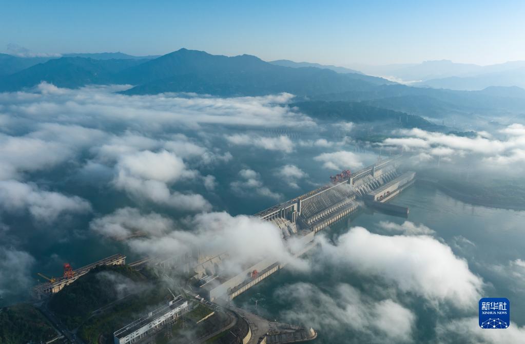 當日,湖北宜昌雨過(guò)天晴,三峽上空云霧繚繞,美景如畫(huà)。