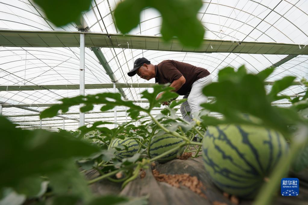 5月17日,河北省柏鄉縣馬村瓜農在管理大棚西瓜。
