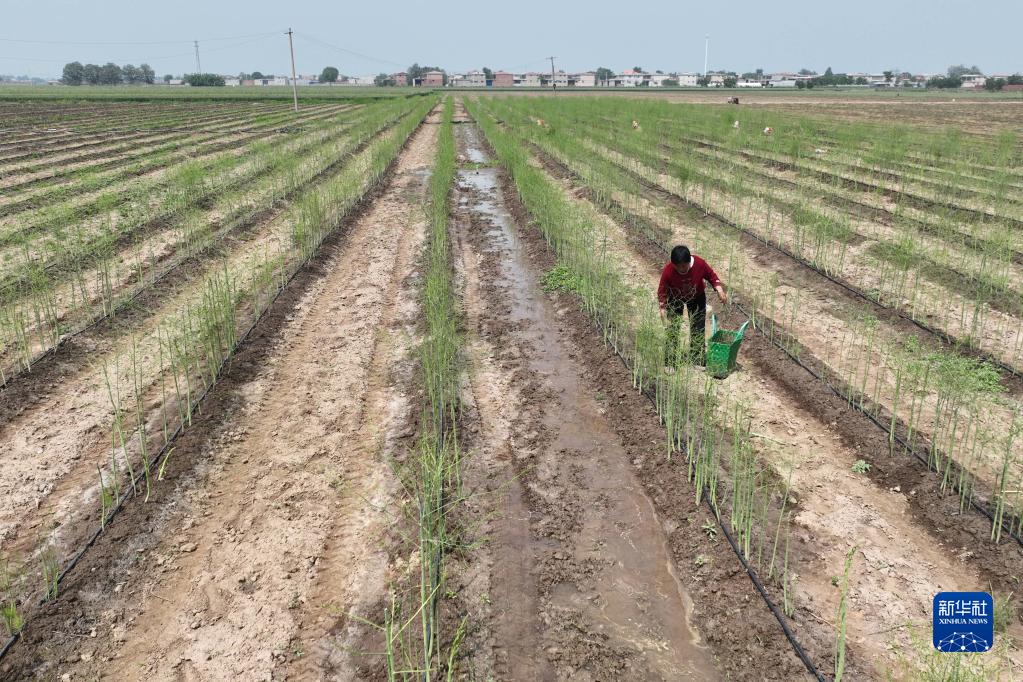 5月17日,河北省柏鄉縣西蘇村農民在采收蘆筍(無(wú)人機照片)。