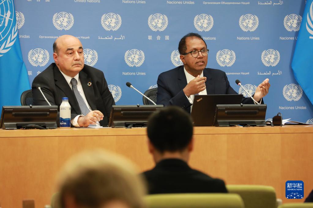 5月16日,在位于紐約的聯(lián)合國總部,聯(lián)合國《2023年世界經(jīng)濟形勢與展望》年中更新報告領(lǐng)銜作者哈米德·拉希德(右)在報告發(fā)布會(huì )上作介紹。