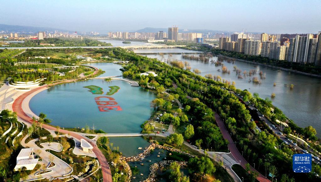 西安浐灞生態(tài)區灞河沿岸風(fēng)光(4月16日攝,無(wú)人機照片)。