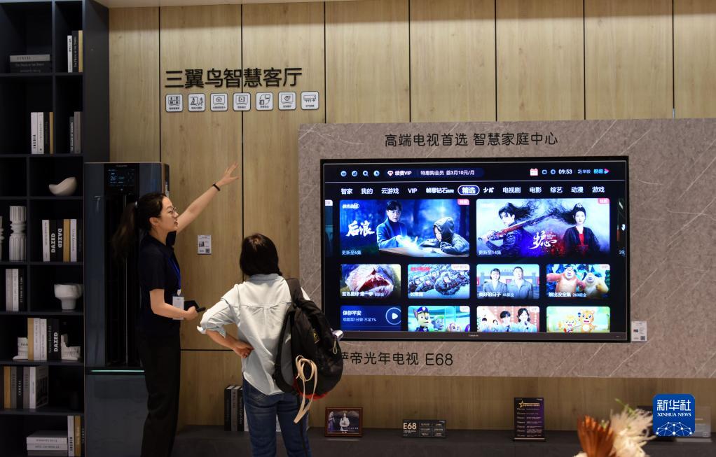 5月17日,一名工作人員在展會(huì )上為參觀(guān)者介紹“智慧客廳”。