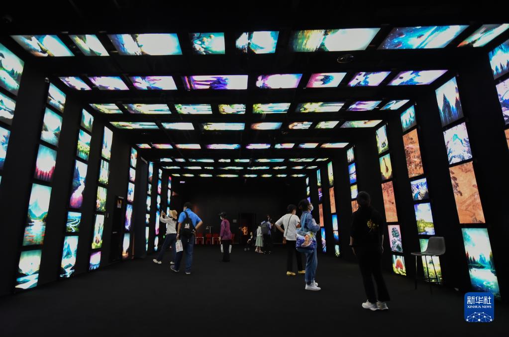 在位于北京的瞭倉數字藏品博物館,觀(guān)眾在一間以永定河生態(tài)為主題,展示動(dòng)態(tài)畫(huà)作、實(shí)景照片和人工智能生成畫(huà)作的展廳里參觀(guān)(5月14日攝)。