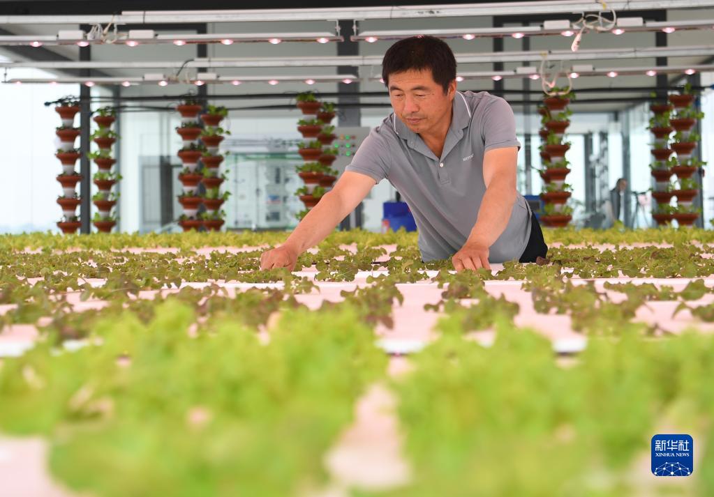 5月17日,饒陽(yáng)縣大尹村鎮萬(wàn)畝蔬菜標準化種植基地工人在溫室查看立體栽培蔬菜生長(cháng)情況。