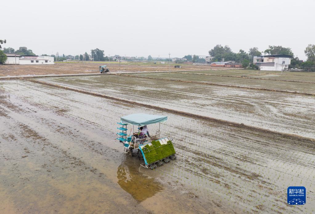 5月17日在廣漢市國家現代農業(yè)產(chǎn)業(yè)園里拍攝的機械化插秧(無(wú)人機照片)。