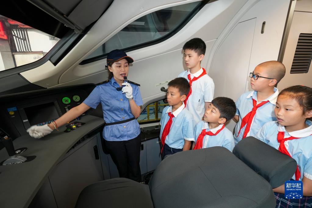 5月17日,中國鐵路成都局集團有限公司重慶車(chē)輛段西動(dòng)車(chē)所的檢修庫內,一名工作人員在復興號智能動(dòng)車(chē)組的駕駛室內向學(xué)生介紹高鐵司機如何駕駛動(dòng)車(chē)組高速運行。