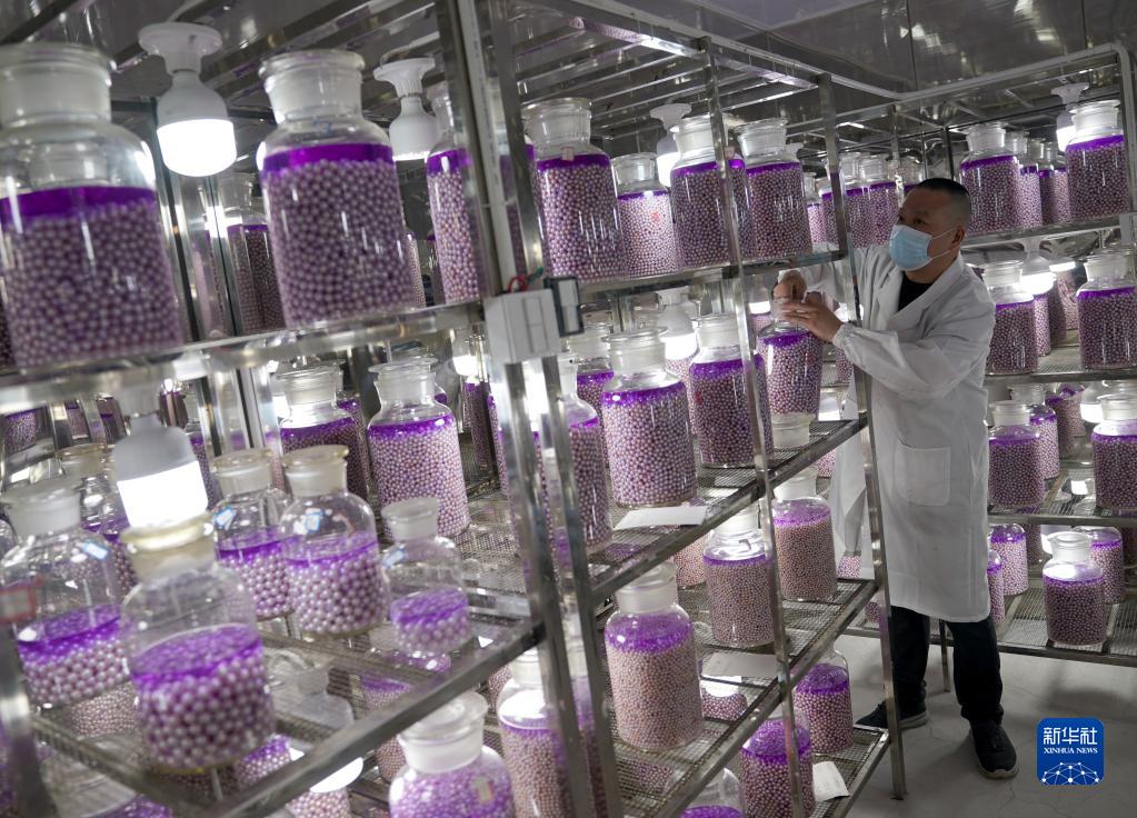 5月17日,浙江省諸暨市山下湖鎮一家珍珠企業(yè)的工作人員查看庫房?jì)冗M(jìn)行增亮處理的珍珠。