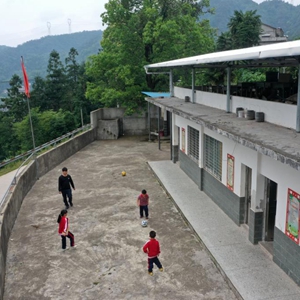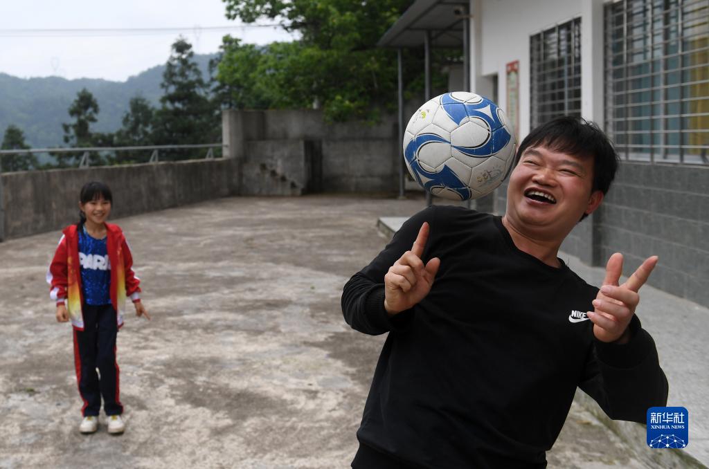5月17日,在廣西靈川縣海洋鄉中心岐教學(xué)點(diǎn),蔡教宏和學(xué)生在課間做游戲。
