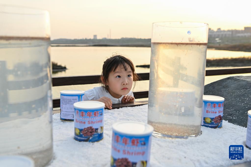5月16日,小朋友在運城鹽湖觀(guān)察展出的鹵蟲(chóng)。
