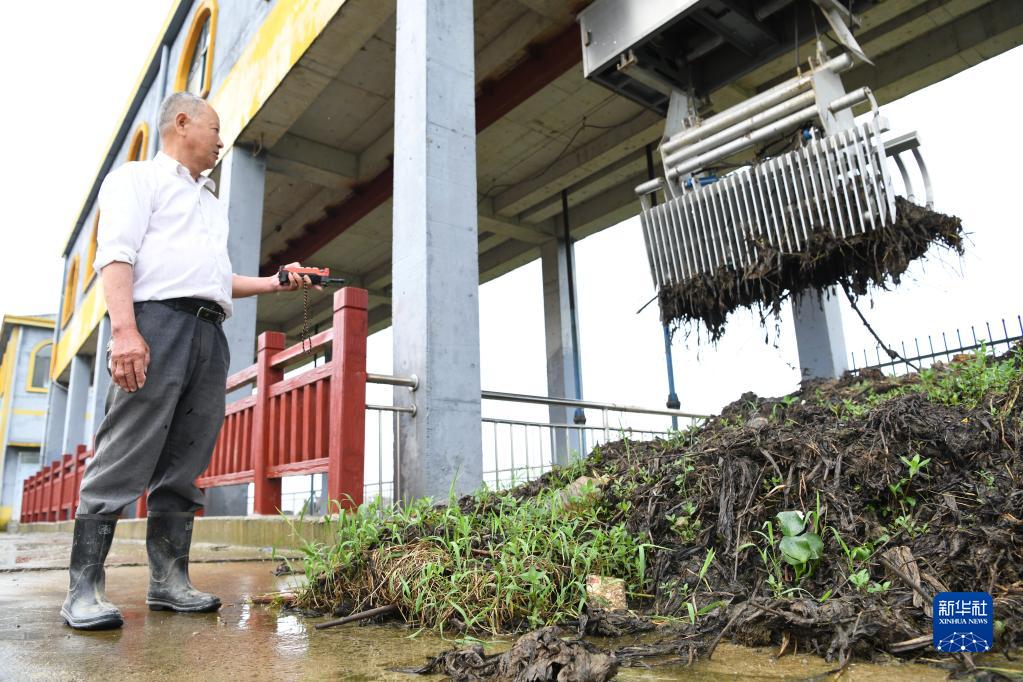 5月17日,在南昌縣幽蘭鎮厚田電排站,工作人員操作電動(dòng)清淤機,清理河道雜物保障水流暢通。