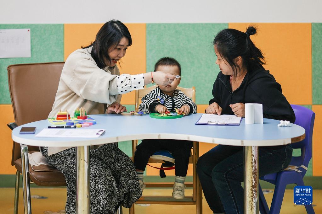 在吉林省聾兒語(yǔ)言聽(tīng)力康復中心,一名小朋友在教師與母親的陪伴下進(jìn)行一對一聽(tīng)覺(jué)訓練(5月17日攝)。