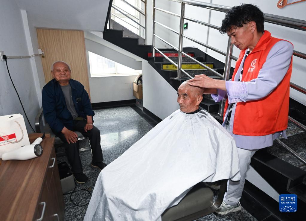 5月18日,志愿者在織里鎮晟舍村居家養老服務(wù)中心為老人進(jìn)行義務(wù)理發(fā)。