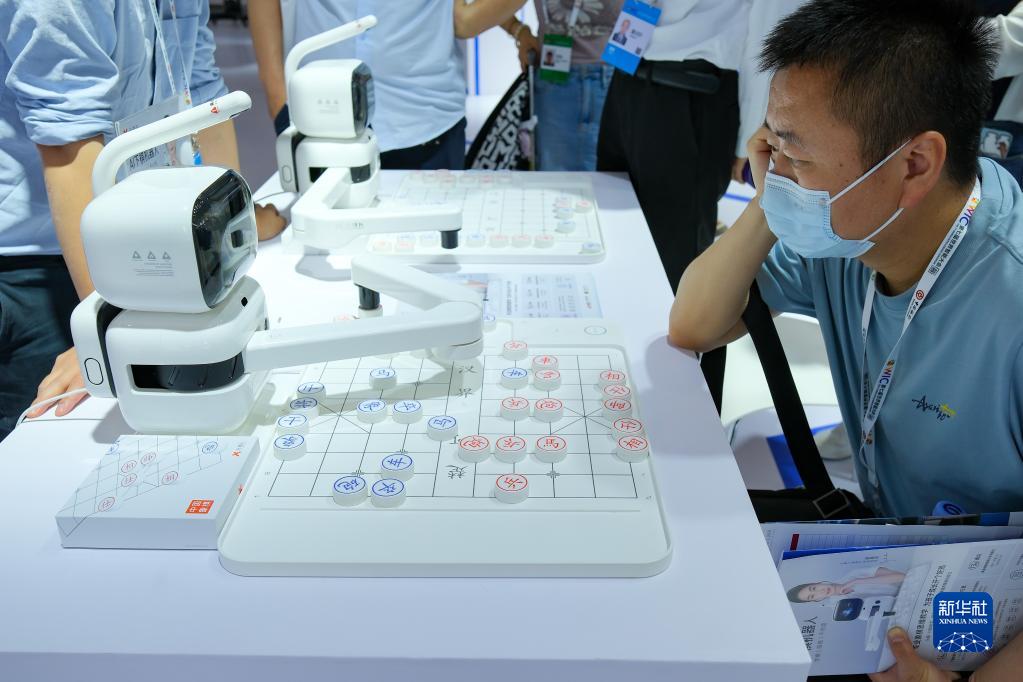 5月18日,一名觀(guān)眾在第七屆世界智能大會(huì )智能科技展上與一款AI象棋機器人對弈。