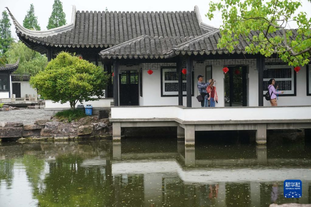 游人在仰圣園內的徐霞客游記碑廊游覽(5月17日攝)。
