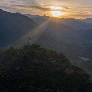 5月16日,在浙江天臺縣,清晨的陽(yáng)光照在赤城山頂的梁妃塔上(無(wú)人機照片)。