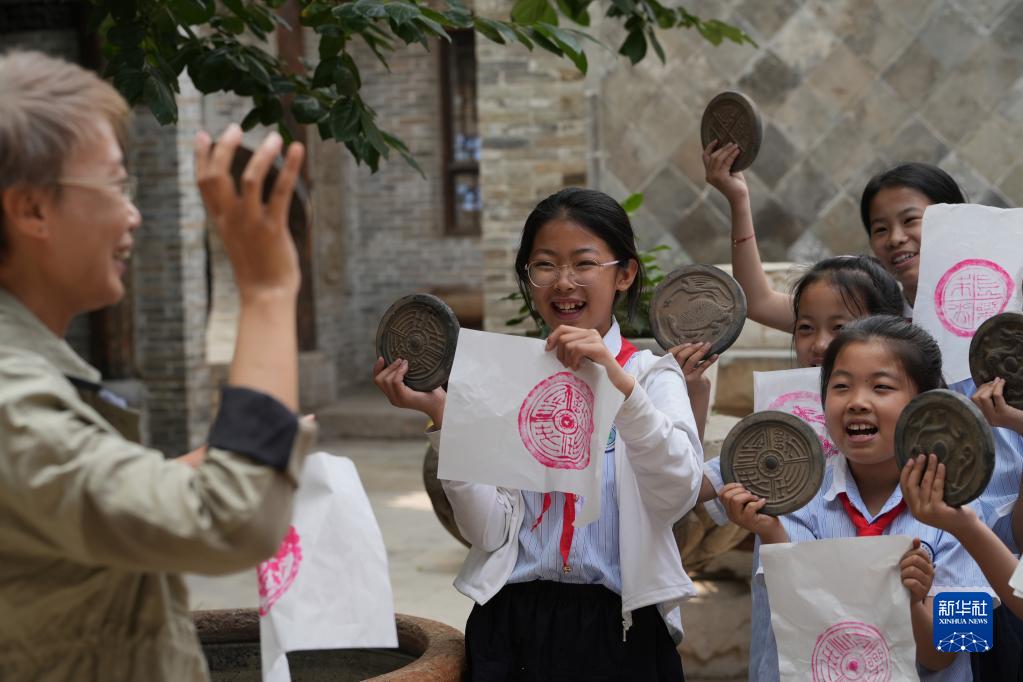 5月18日,小學(xué)生在河北省石家莊市新華區一家清代建筑博物館體驗瓦當拓片。