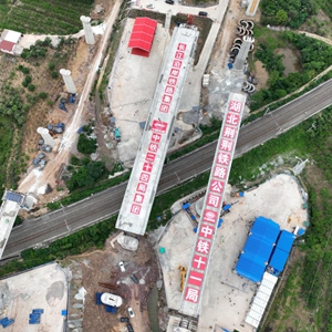 5月18日,荊荊高鐵荊門(mén)特大橋轉體梁與滬渝蓉高鐵太白集特大橋轉體梁,分別實(shí)現成功對接,跨越焦柳鐵路。