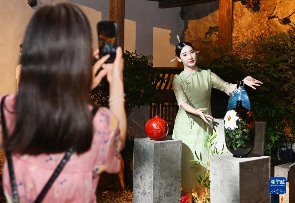5月18日,觀(guān)眾在福州市三坊七巷歷史文化街區參觀(guān)拍攝傳統漆器工藝品的沉浸式實(shí)景展示。新華社記者 李賀 攝