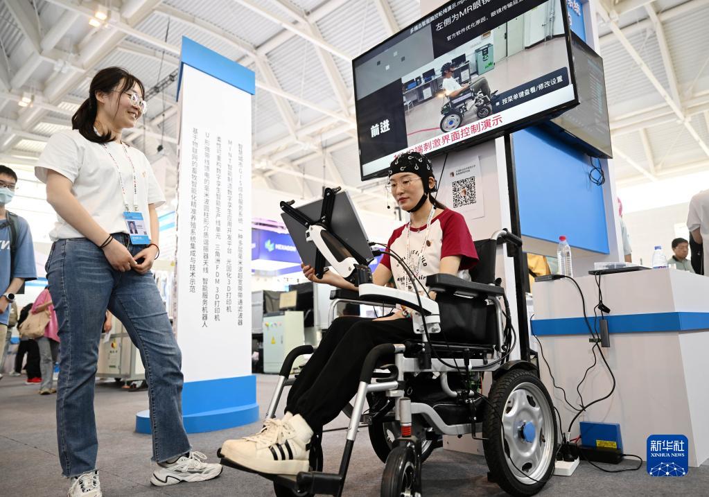 5月19日,觀(guān)眾在第七屆世界智能大會(huì )智能科技展上體驗智能腦控輪椅。