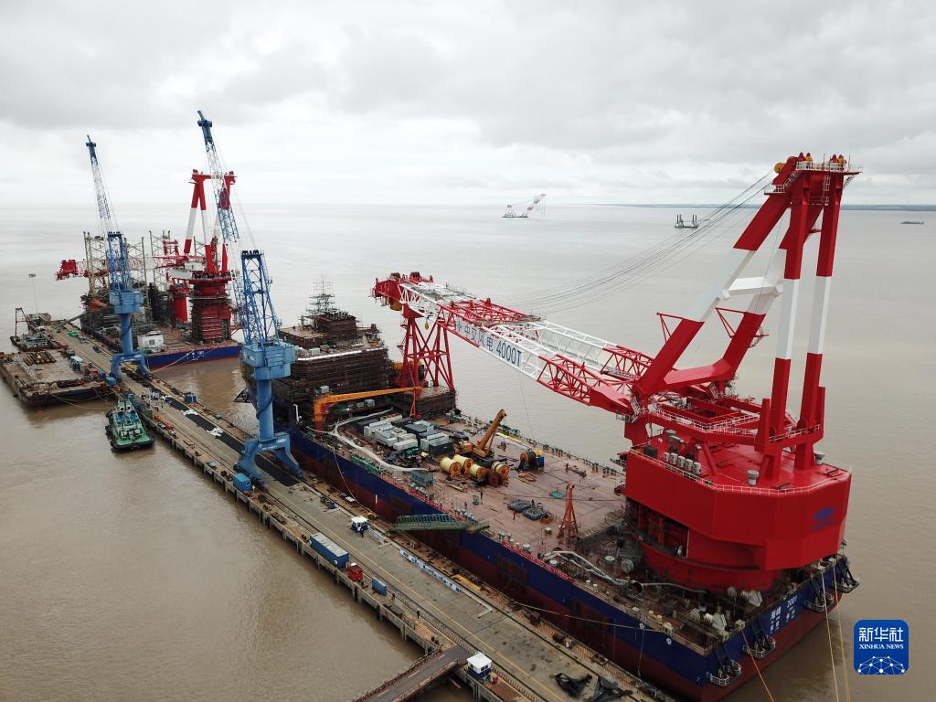 這是5月19日在江蘇省南通市啟東海工船舶工業(yè)園拍攝的,由上海振華重工啟東海洋工程股份有限公司正在建設中的4000噸全回轉起重船(右)和1800噸風(fēng)電安裝平臺(無(wú)人機照片)。