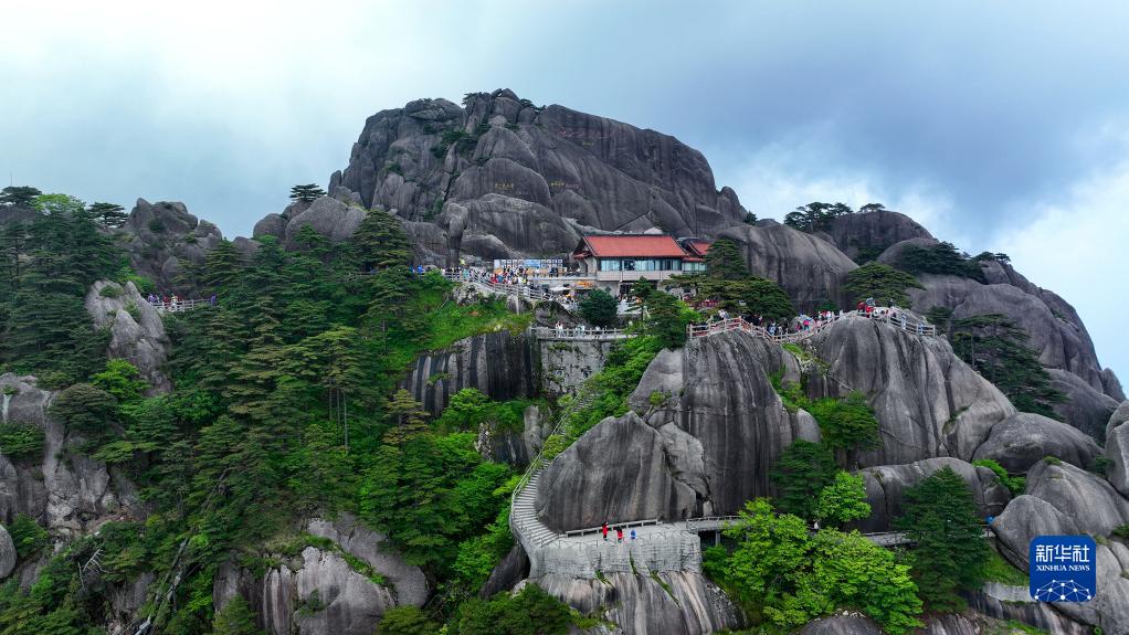 5月18日,游客在安徽黃山風(fēng)景區玉屏景區游覽(無(wú)人機照片)。
