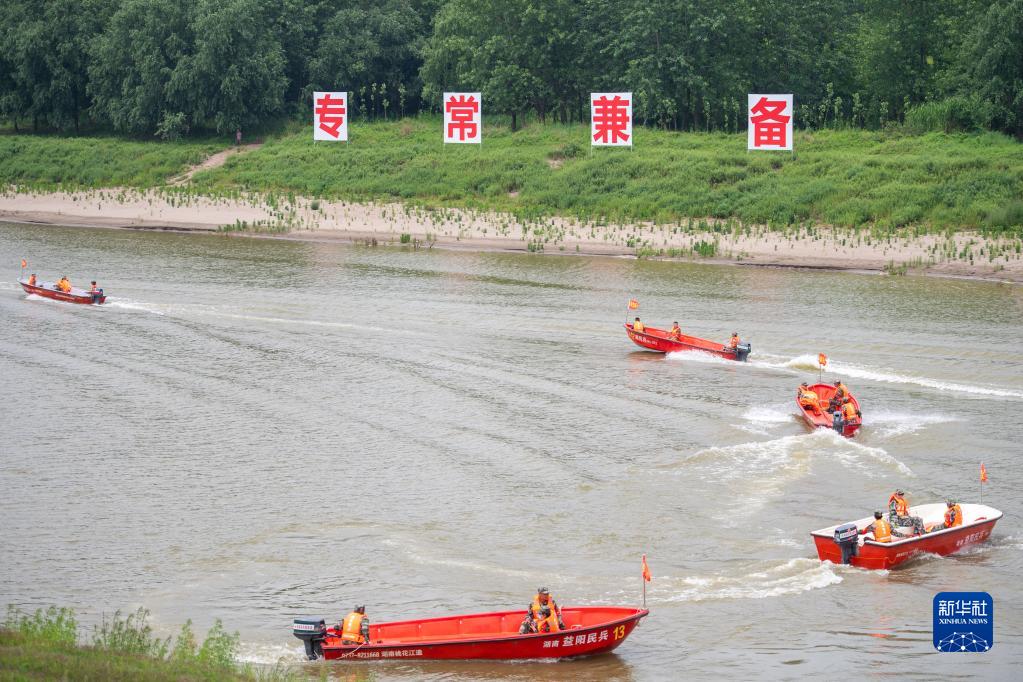5月19日,在洞庭湖區防汛搶險應急救援演練中,參演人員進(jìn)行沖鋒舟水上編隊演練。