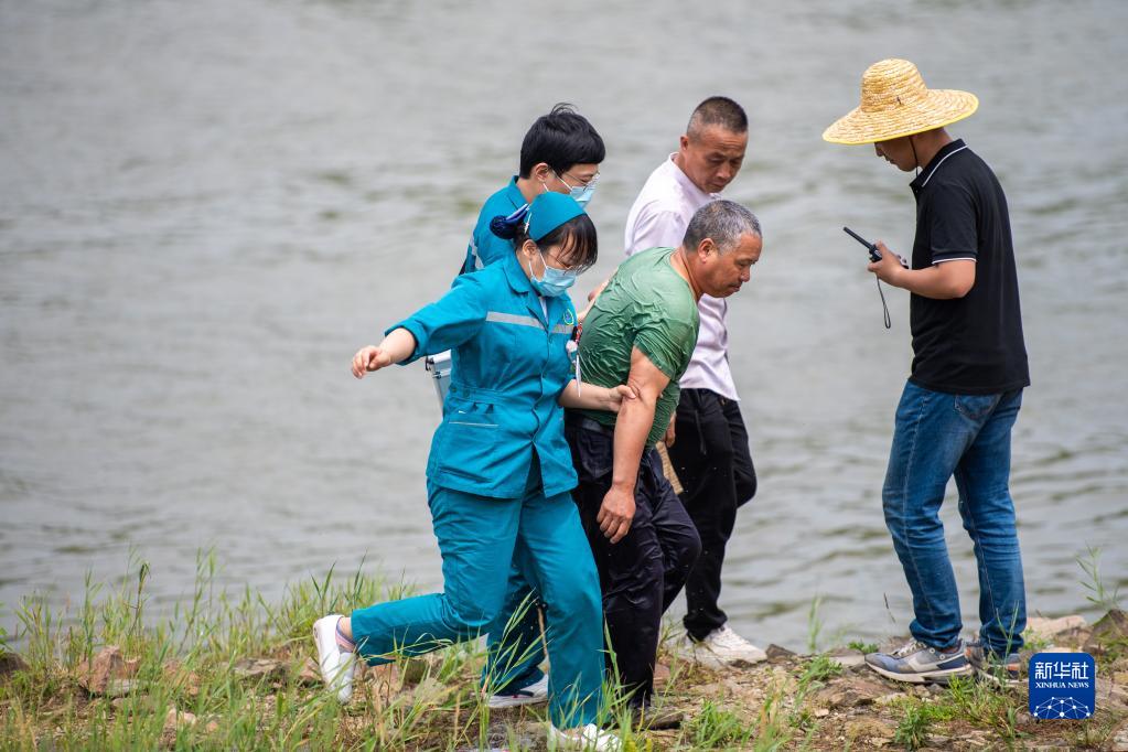 5月19日,在洞庭湖區防汛搶險應急救援演練中,醫務(wù)人員在演練救助落水群眾。