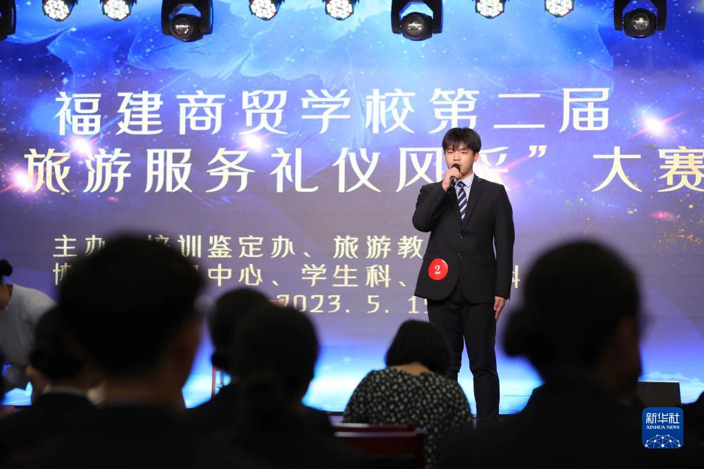 5月19日,福建商貿學(xué)校學(xué)生在進(jìn)行旅游服務(wù)禮儀比賽。