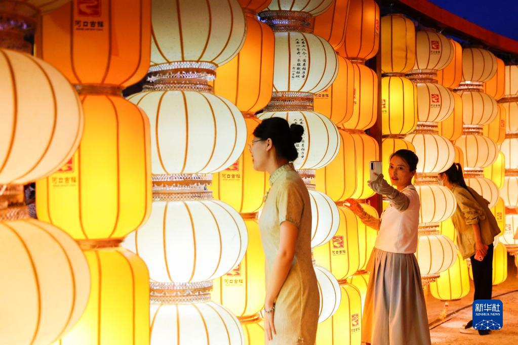5月19日,游客在河口古鎮“黃河燈展”上拍照留念。