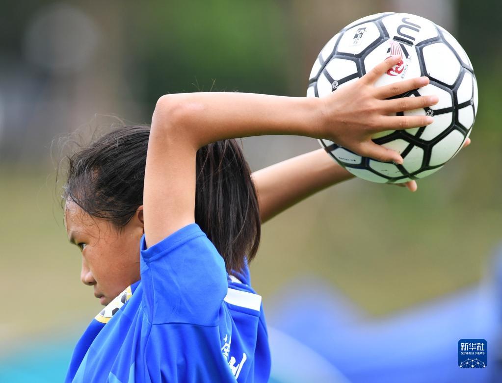 在海南瓊中縣舉辦的中國足協(xié)女足青訓中心“希望杯”U12組四川隊對陣廣東隊的比賽中,來(lái)自涼山彝族自治州的四川隊球員舍布么扯鳩莫發(fā)邊線(xiàn)球(4月10日攝)。