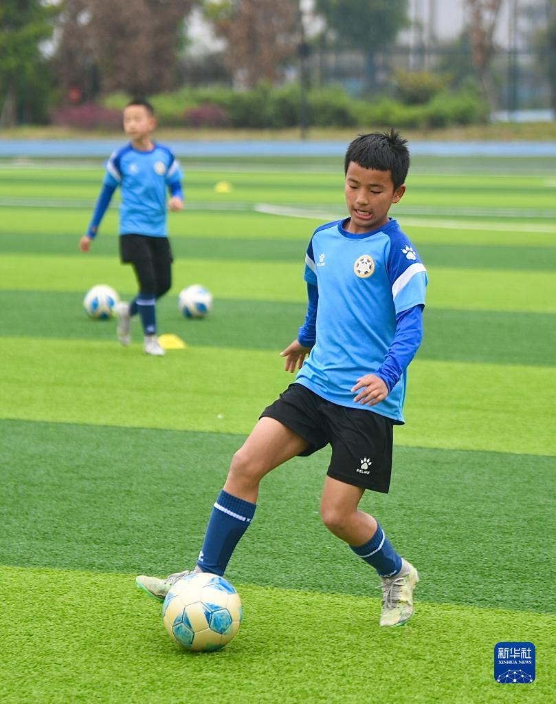 在瀘州天立春雨學(xué)校足球場(chǎng),來(lái)自涼山彝族自治州的楊坤在進(jìn)行訓練(3月28日攝)。
