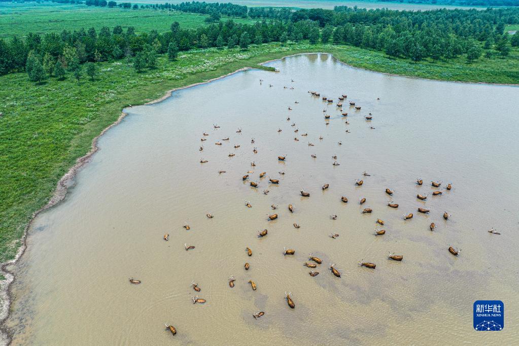 5月19日,一群麋鹿在湖北石首麋鹿國家級自然保護區內活動(dòng)(無(wú)人機照片)。
