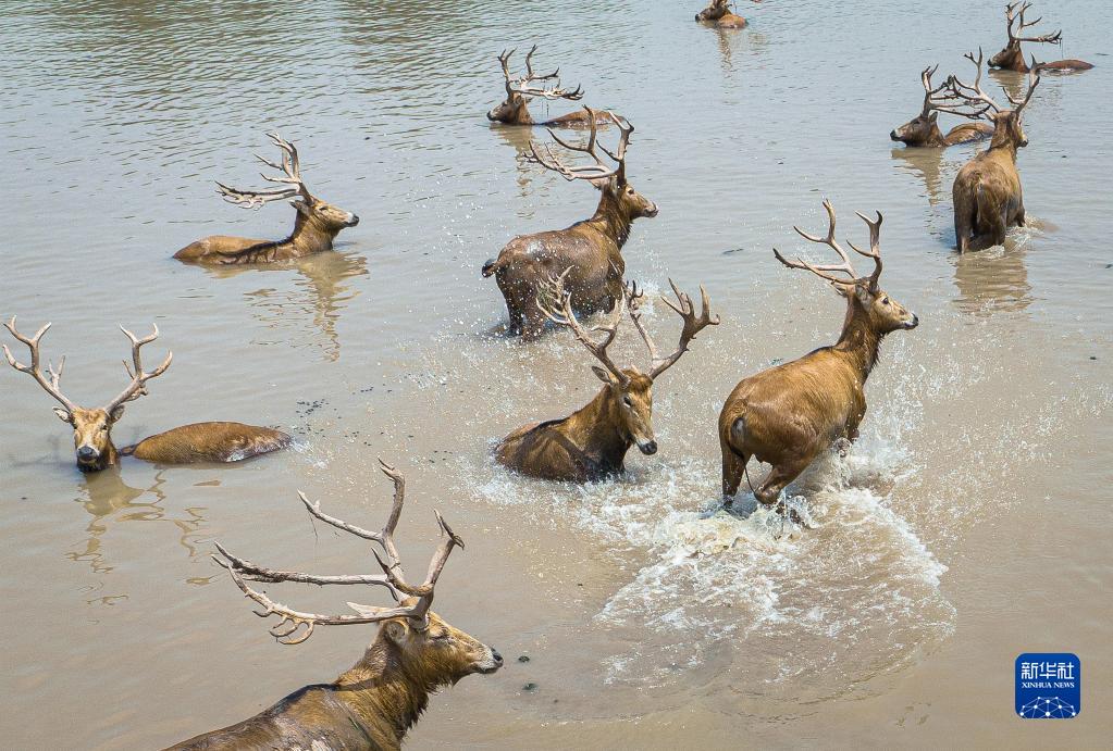 5月19日,一群麋鹿在湖北石首麋鹿國家級自然保護區內活動(dòng)(無(wú)人機照片)。