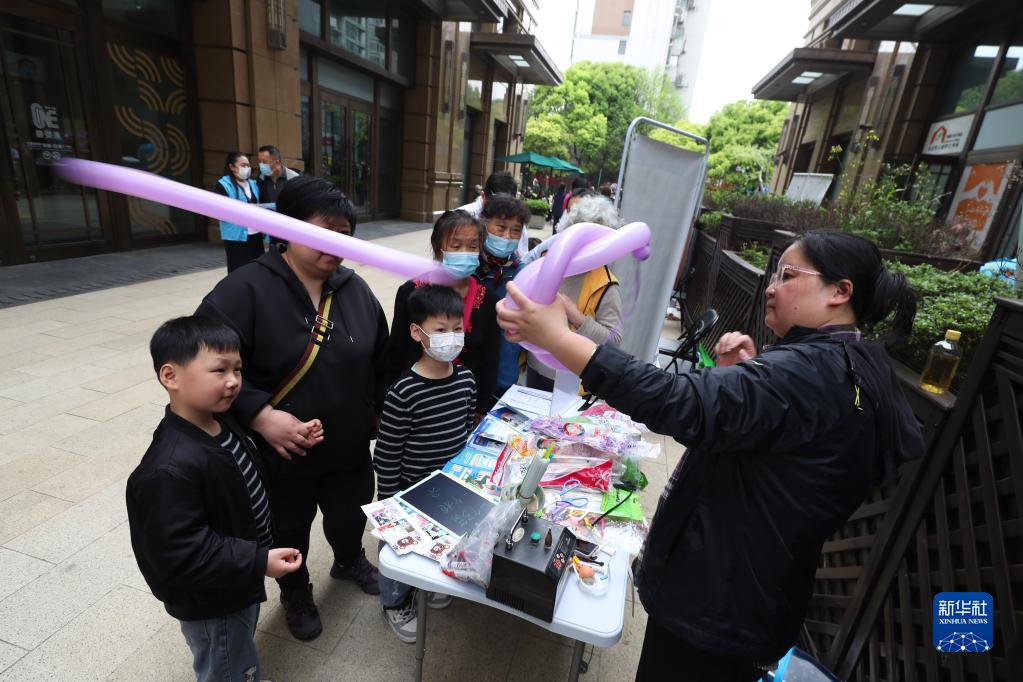 在上海黃浦區小東門(mén)街道舉行的公益集市上,劉瑩為小朋友演示她制作的氣球“弓箭”(4月15日攝)。