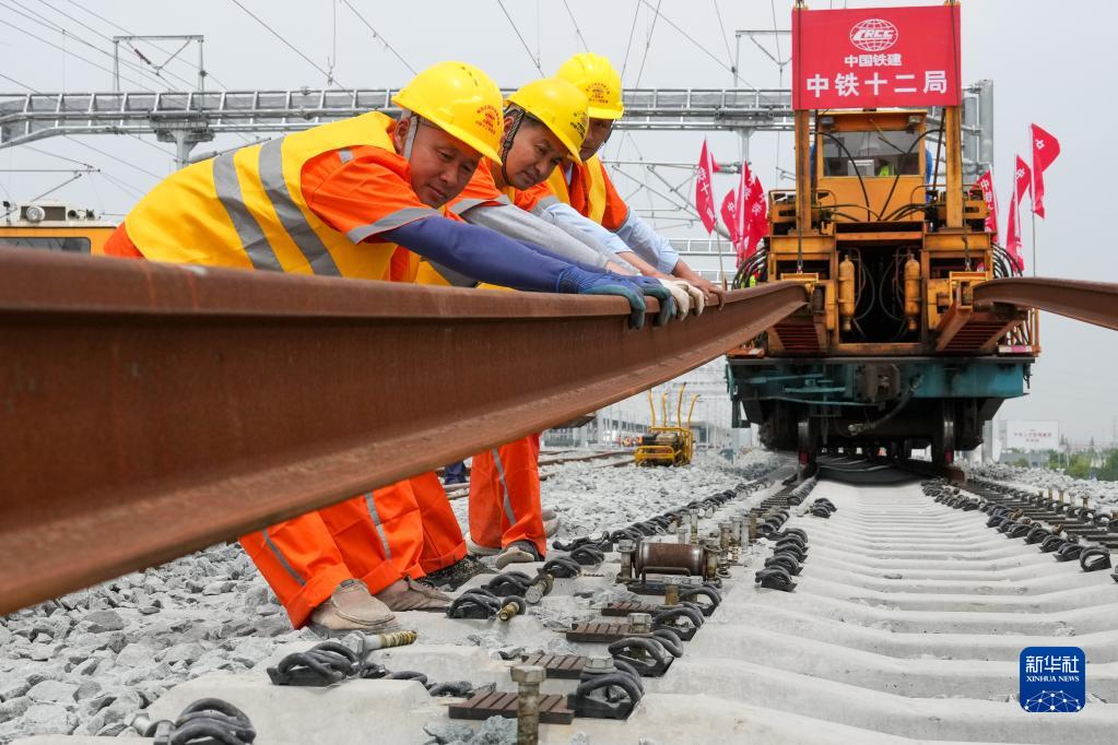 5月20日,在滬寧沿江高鐵太倉站施工現場(chǎng),中鐵十二局的工程人員利用機械將鋼軌放入承軌槽。