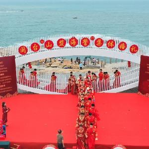 當日,一場(chǎng)以“愛(ài)情恒久遠、幸福長(cháng)相伴”為主題的閩臺“山盟海誓”集體婚禮暨2023年閩臺婚姻家庭交流活動(dòng)在福建省福州市平潭縣舉辦。21對閩臺新人身穿紅色中式婚服,手牽紅繡球,行跨火盆、踩瓦片、扎繡球和“合茶”、“合巹”、“海誓”等閩臺傳統結婚禮儀,結下跨越海峽的姻緣。