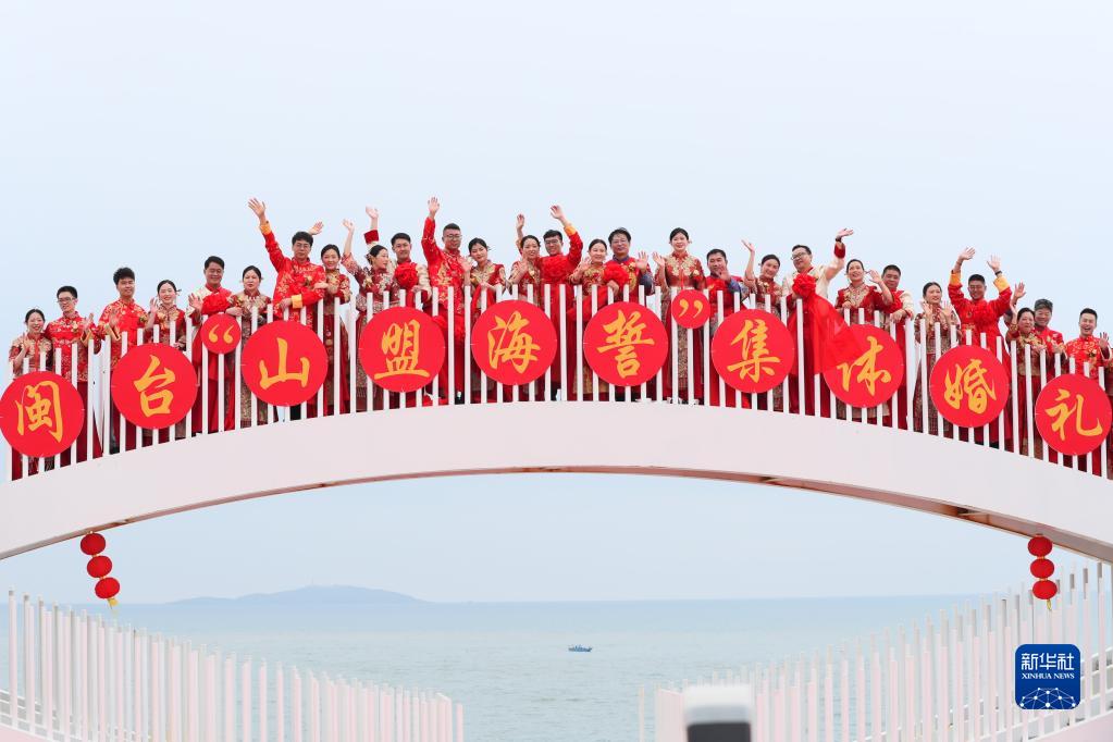 當日,一場(chǎng)以“愛(ài)情恒久遠、幸福長(cháng)相伴”為主題的閩臺“山盟海誓”集體婚禮暨2023年閩臺婚姻家庭交流活動(dòng)在福建省福州市平潭縣舉辦。21對閩臺新人身穿紅色中式婚服,手牽紅繡球,行跨火盆、踩瓦片、扎繡球和“合茶”、“合巹”、“海誓”等閩臺傳統結婚禮儀,結下跨越海峽的姻緣。