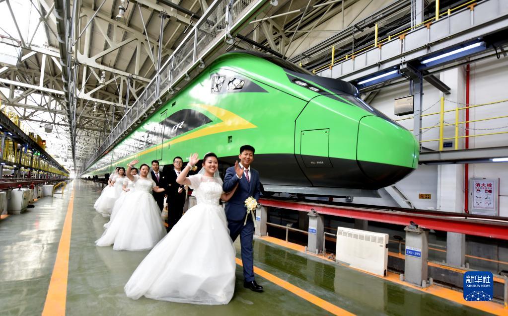 5月20日,新人們以休整中的動(dòng)車(chē)組列車(chē)為背景拍攝婚紗照。