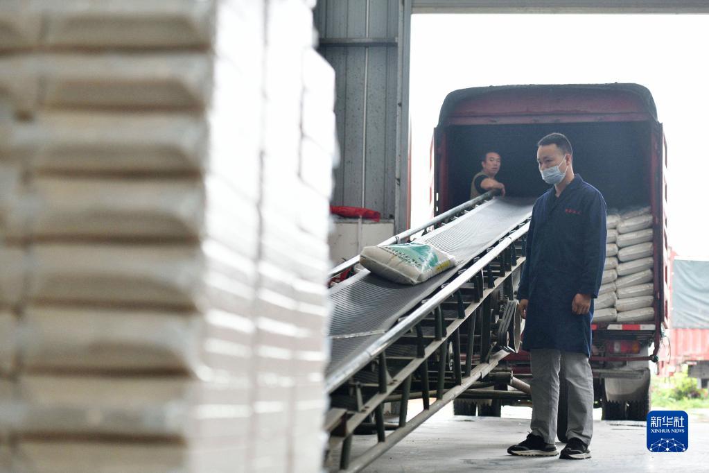 5月20日,工人在貴州省黔東南苗族侗族自治州施秉縣桃子灣工業(yè)園區一家大米加工企業(yè)運輸大米。