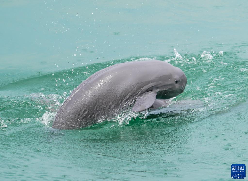 5月20日,江豚在湖北省宜昌市葛洲壩下游水域逐浪嬉戲。