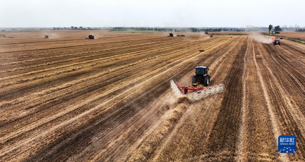 5月18日,在湖北省襄陽(yáng)市襄州區古驛鎮大營(yíng)村,農民駕駛農機收割小麥。新華社發(fā)(安富斌攝)