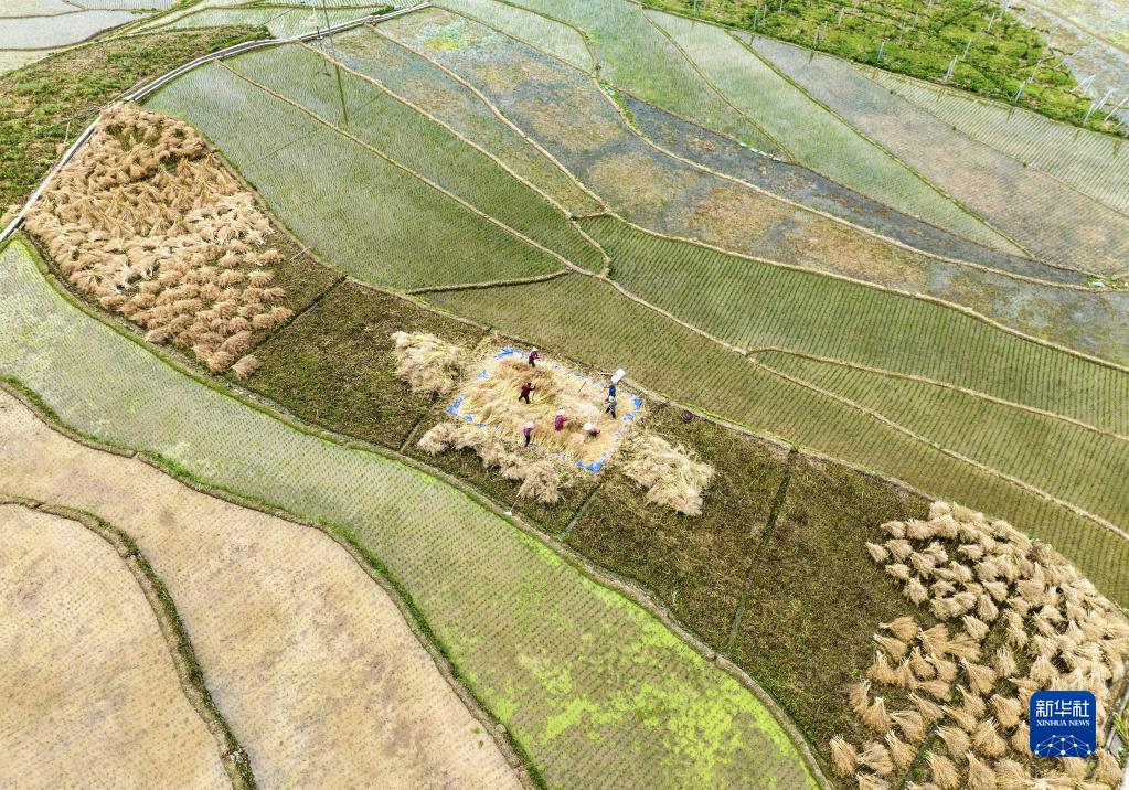 5月19日,在湖北省宜昌市秭歸縣九畹溪鎮石柱村,村民在田間收獲油菜籽(無(wú)人機照片)。新華社發(fā)(王罡攝)