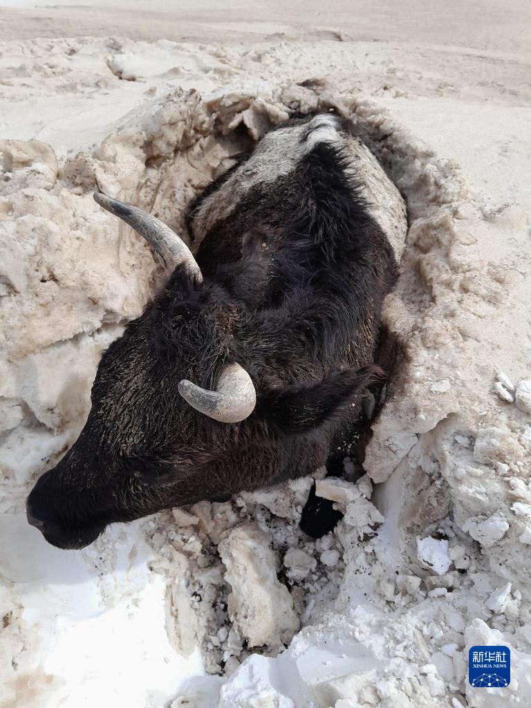5月20日,在蒙古國蘇赫巴托爾省,一頭牛被埋在雪堆中。