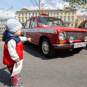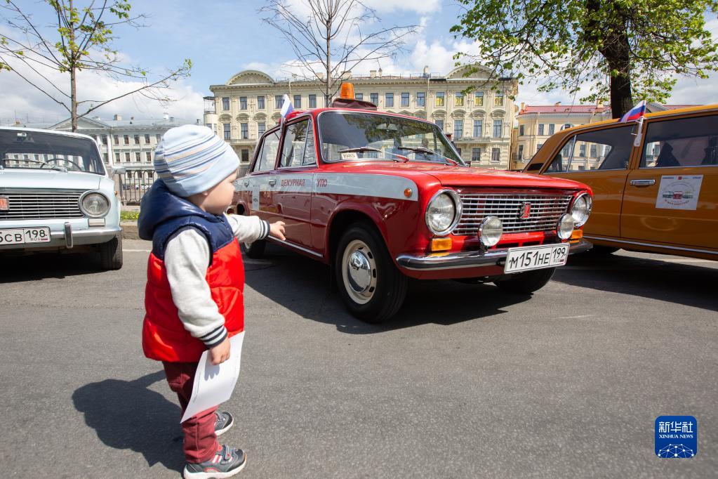 5月20日,小朋友在俄羅斯圣彼得堡參觀(guān)街頭老爺車(chē)展。